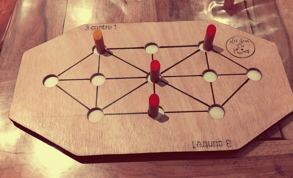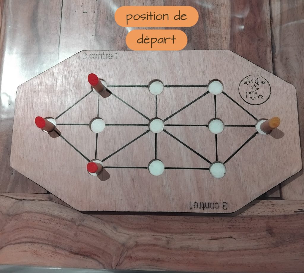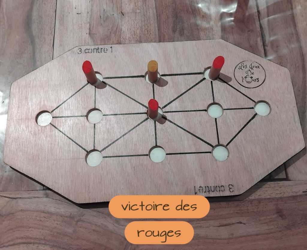 Un joueur joue avec les trois pions rouges, et l’autre avec le pion jaune.